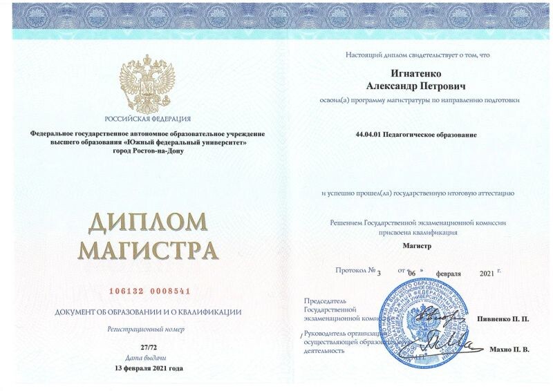 - Южный федеральный университет, Академия психологии и педагогики, направление «Педагогическое образование», магистрант, 2018–2021 гг.