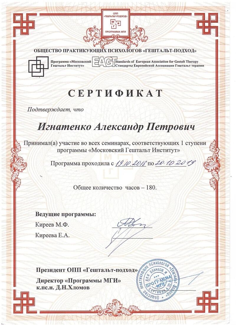 - Московский гештальт институт, ОПП "Гештальт-подход", 180 часов, 2018–2019 гг.