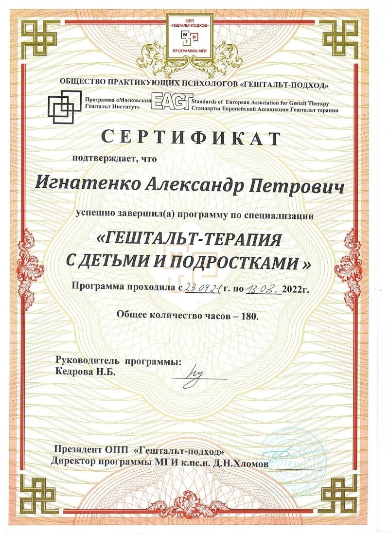 - Общество практикующих психологов "Гештальт-подход", программа "Гештальт-терапия с детьми и подростками", 2021–2022 гг.