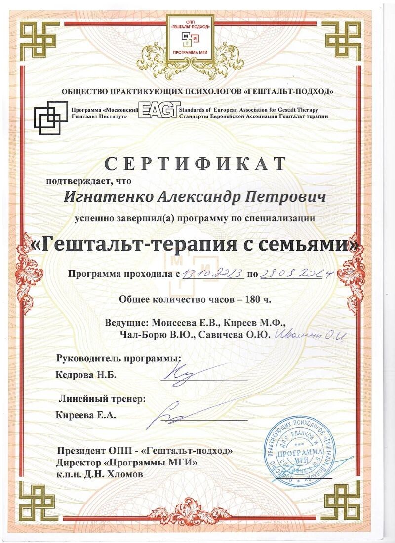 - Общество практикующих психологов "Гештальт-подход", программа "Гештальт-терапия в работе с семьёй и парами", 2023–2024 гг.