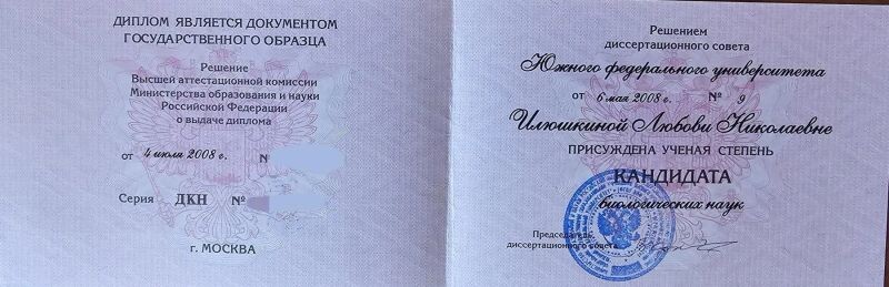 - Южный федеральный университет, кандидат биологических наук, 2008 г.