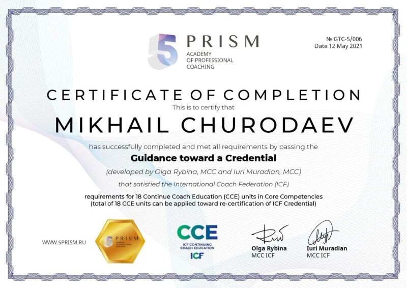 - Академия коучинга 5 призм, Guidance toward a Credential, 2021 г.