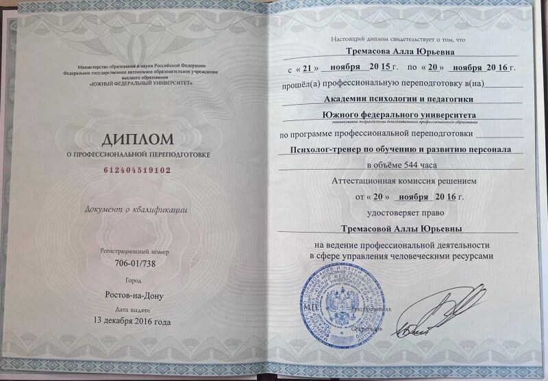 - ФГАОУ ВО «Южный федеральный университет», профессиональная переподготовка по программе профессионального образования «Психолог-тренер по обучению и развитию персонала», 2015–2016 гг.