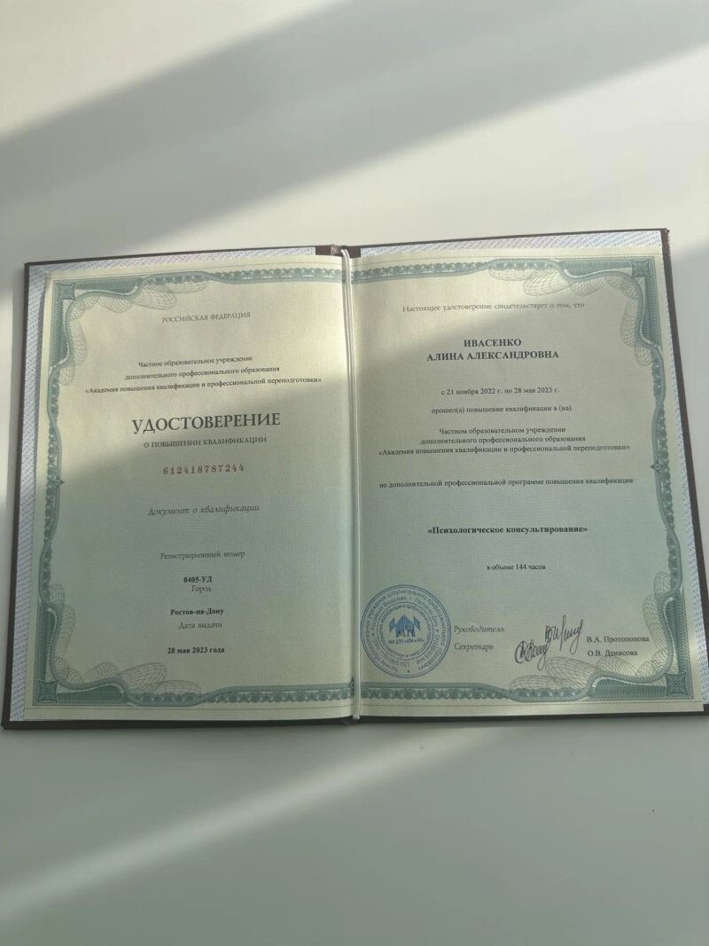 - Академия повышения квалификации и профессиональной переподготовки, психологическое консультирование, 2022–2023 гг.