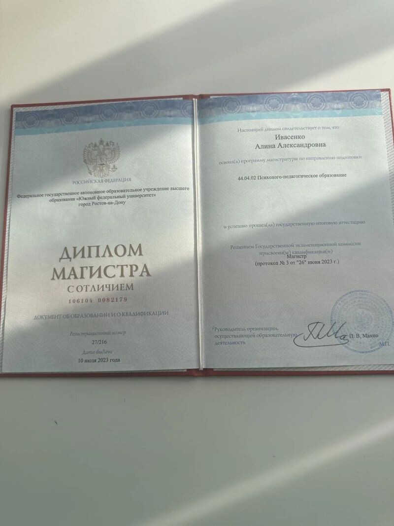 - Южный федеральный университет, психолого-педагогическое образование, магистр, 2021–2023 гг.