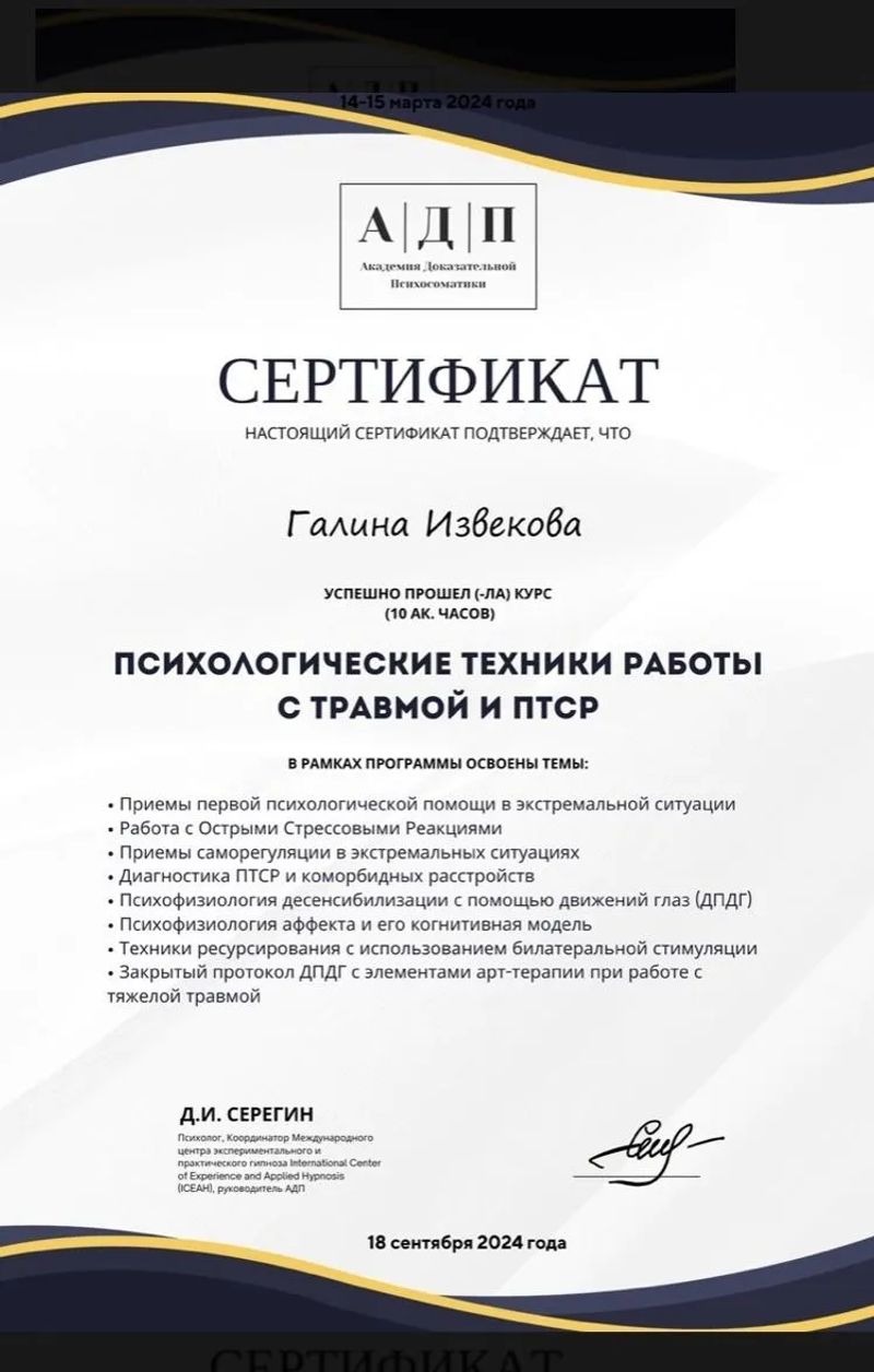 - Академия доказательной психосоматики, психологические техники работы с травмой и ПТСР, 2024 г.