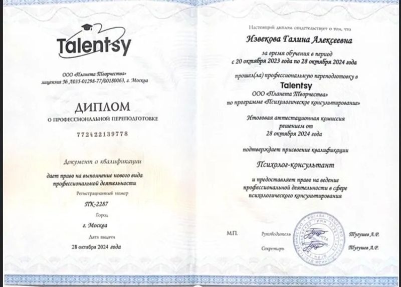 - ООО «Планета творчества», психологическое консультирование, 2023–2024 гг.