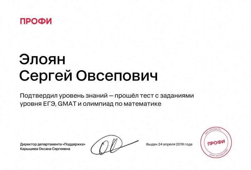 Дорогой Сергей Овсепович! Хочу выразить свою благодарность от себя и своих родителей за отличную подготовку к ЕГЭ по информатике и математике! Благодаря вам я получил максимально высокие результаты по этим предметам и смог успешно сдать экзамены. Благодарю вас за ваше понимание, поддержку и ценные советы! Вы - талантливый и терпеливый учитель, с которым приятно общаться. Я очень ценю ваш труд! Преподаватель, который действительно передает знания!