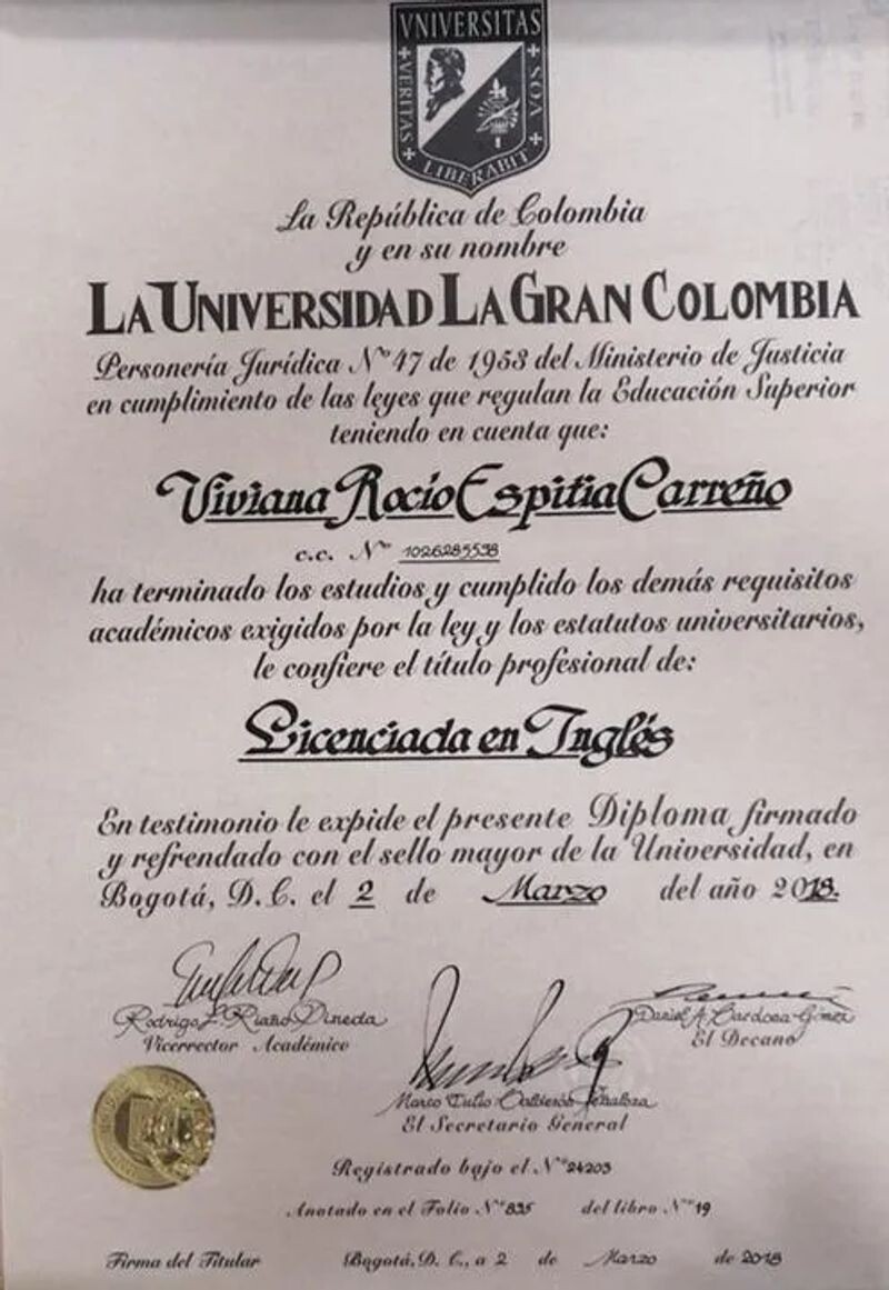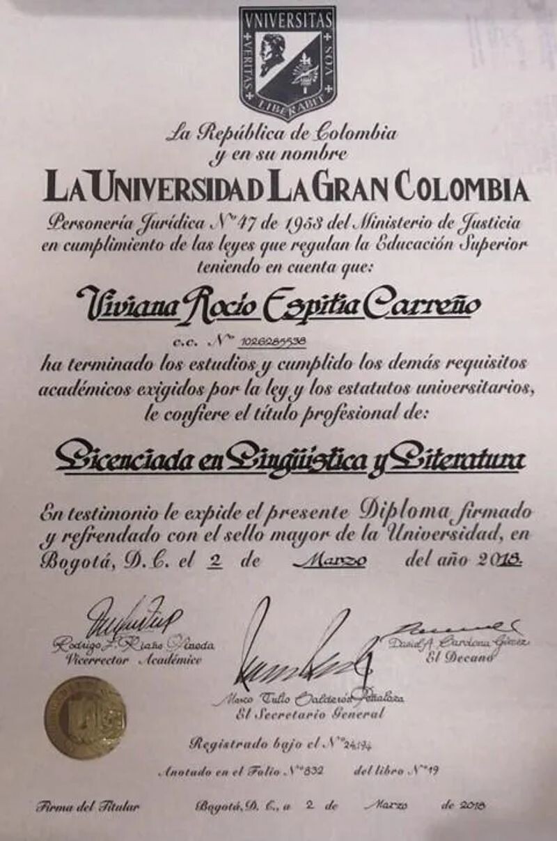 - La Universidad La Gran Colombia, licenciatura en lingüística y literatura, 2012–2013 гг.