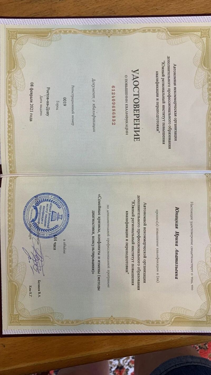 - Южный региональный институт повышения квалификации и переподготовки, повышение квалификации по программе «Технология системной работы семейного психолога», 2025 г.