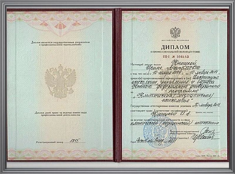 - ЮФУ, Институт психологии, управления и бизнеса, клиническая (медицинская) психология, 2009–2011 гг.