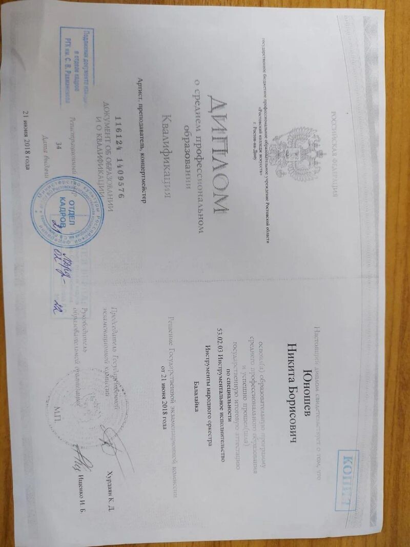 - Ростовский колледж искусств, специальность «Инструментальное исполнительство. Инструменты народного оркестра. Балалайка», квалификация артист, преподаватель, концертмейстер, 2014–2018 гг.
