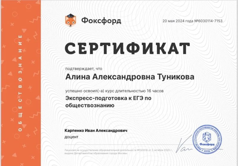 Огромное спасибо Алине за то, что хорошо подготовила меня к ЕГЭ по обществознанию за оочень короткий срок! Лучший репетитор по обществознанию!!!