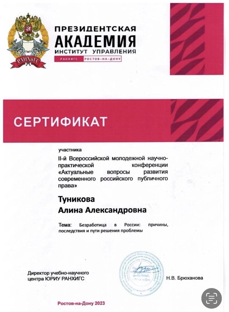 - Сертификат участника ll-й Всероссийской молодёжной научно-практической конференции «Актуальные вопросы развития современнного российского публичного права», 2023 г.