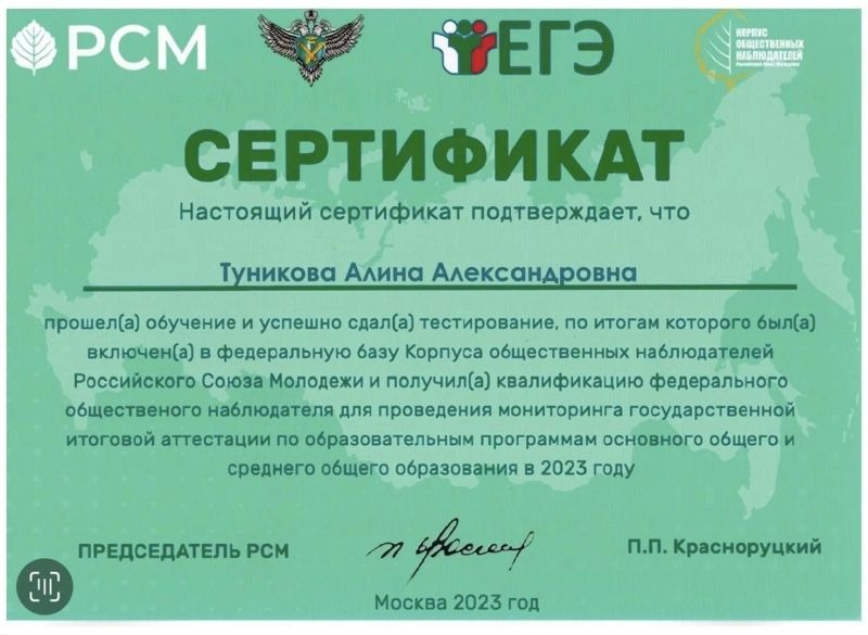 - Сертификат-подтверждение о прохождении тестирования и включения в базу Федеральных общественных наблюдателей ОГЭ и ЕГЭ, 2023 г.