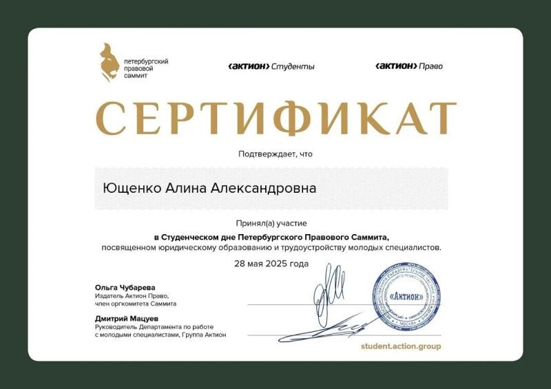 - Студенческий день Петербургского правового саммита, участник, 2025 г.
