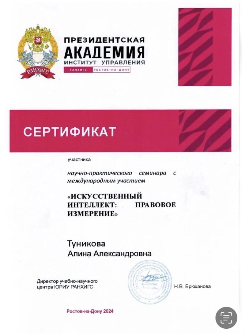 - Научно-практический семинар с международным участием «Искусственный интеллект: правовое измерение», участник, 2024 г.