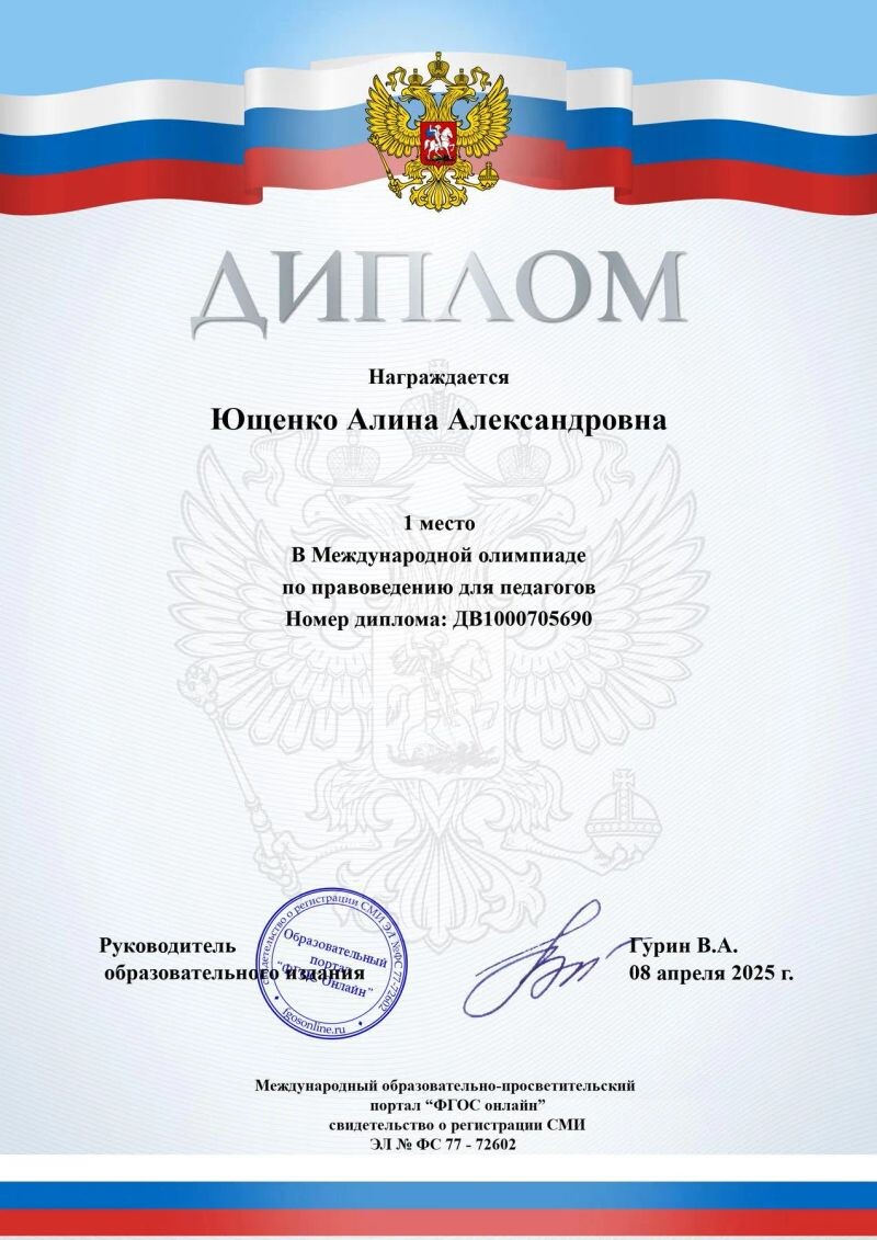 - Международная олимпиада по правоведению для педагогов, 1 место, 2025 г.
