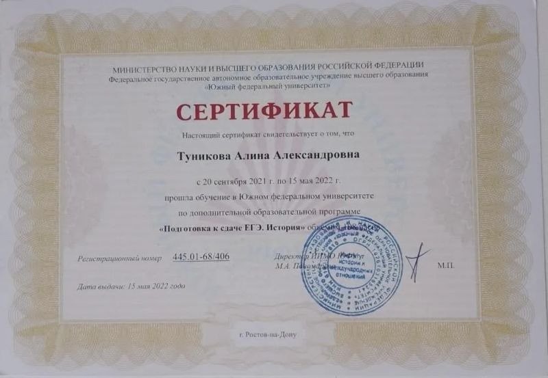 - Южный федеральный университет, программа «Подготовка к сдаче ЕГЭ. История», 2021–2022 гг.