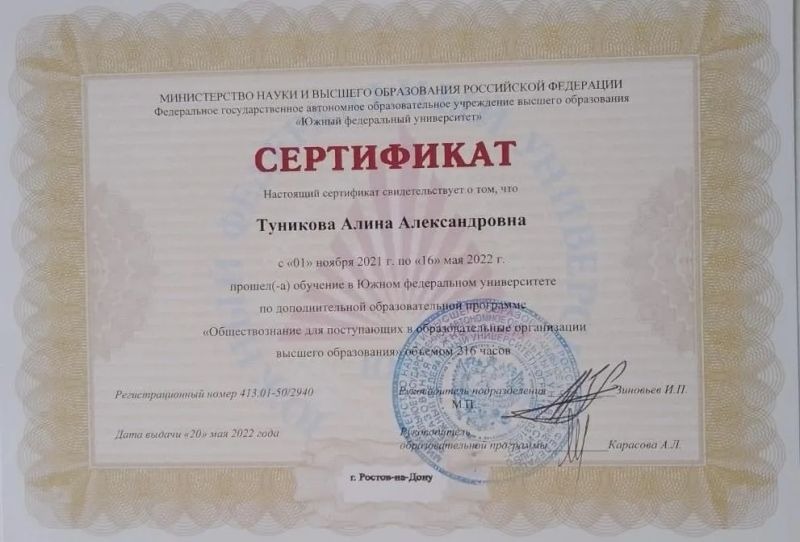 - Южный федеральный университет, программа «Обществознание для поступающих в образовательные организации высшего образования», 2021–2022 гг.