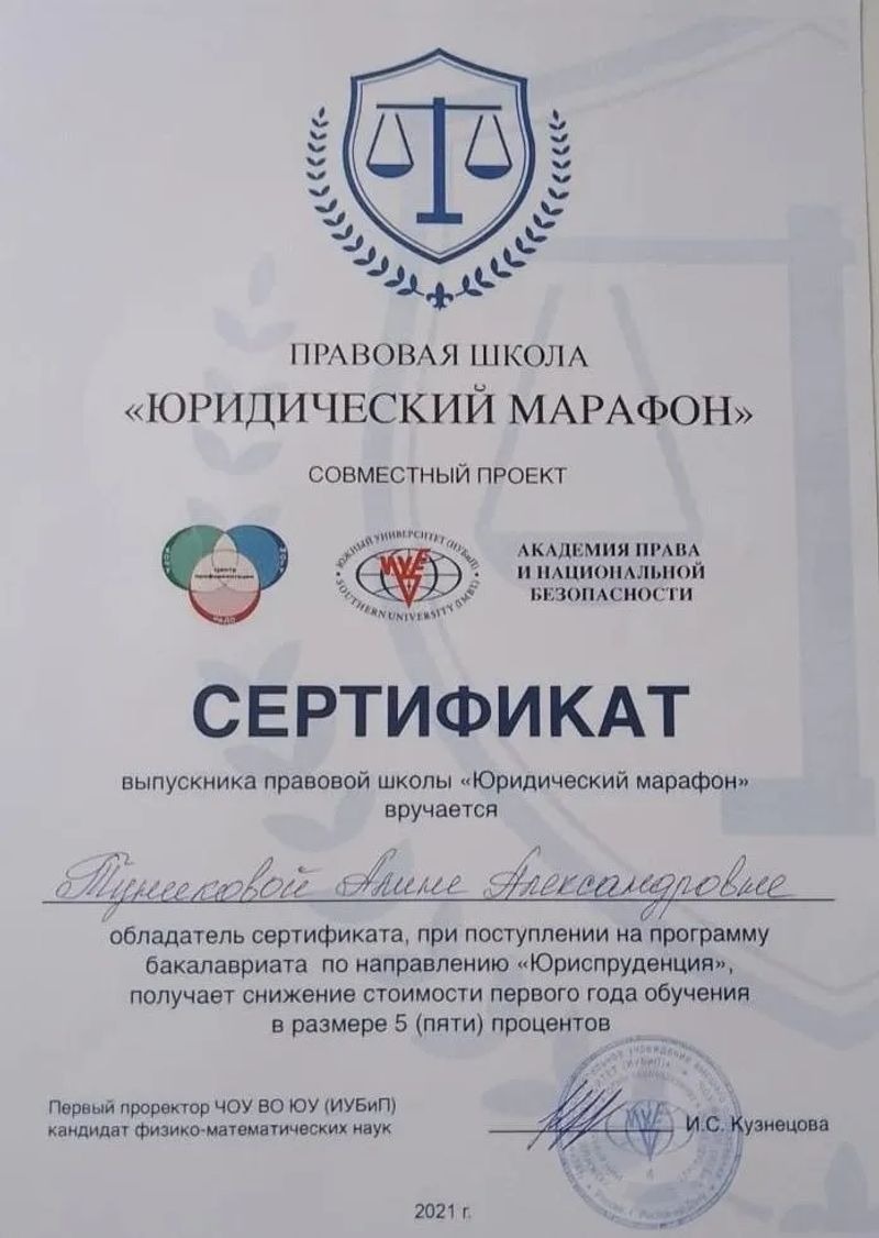 - Правовая школа «Юридический марафон», юриспруденция, 2021 г.