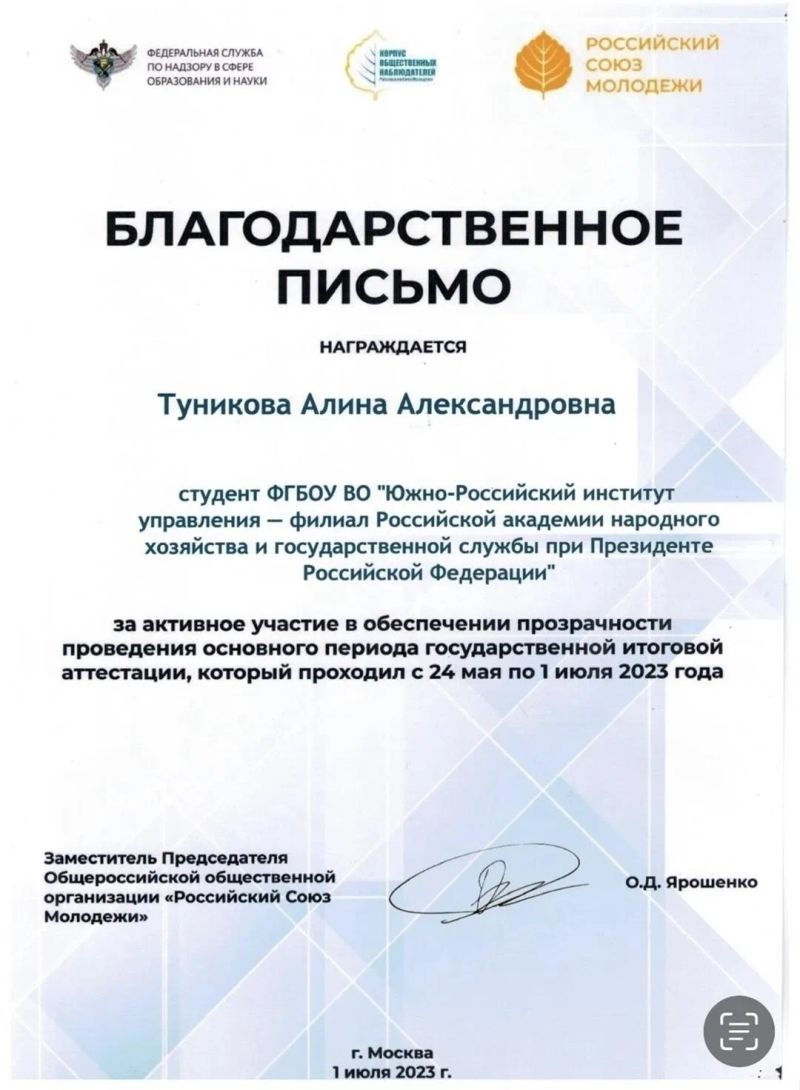 - Российский союз молодёжи, благодарственное письмо за активное участие в обеспечении прозрачности проведения основного периода государственной итоговой аттестации, 2023 г.