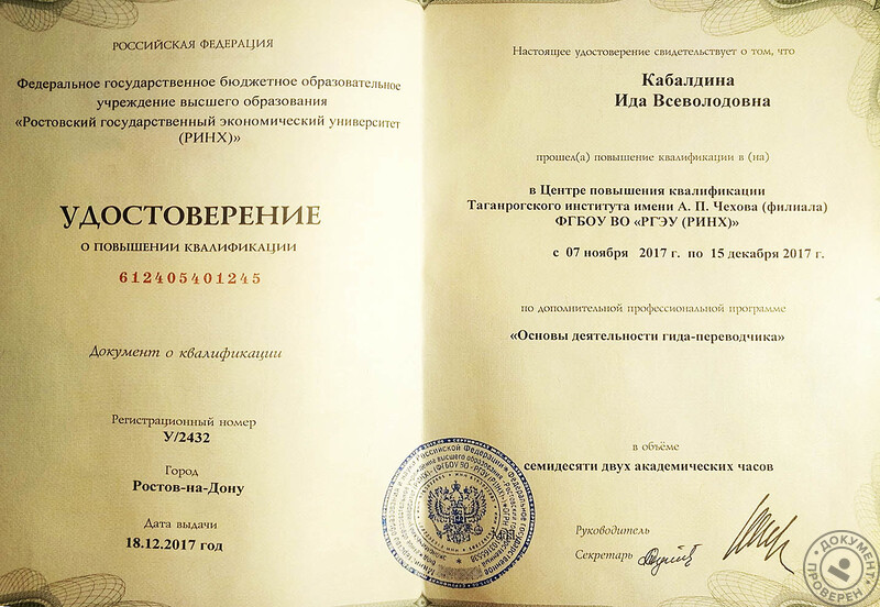 - «Основы деятельности гида-переводчика», РГЭУ (РИНХ) (2017 г.).