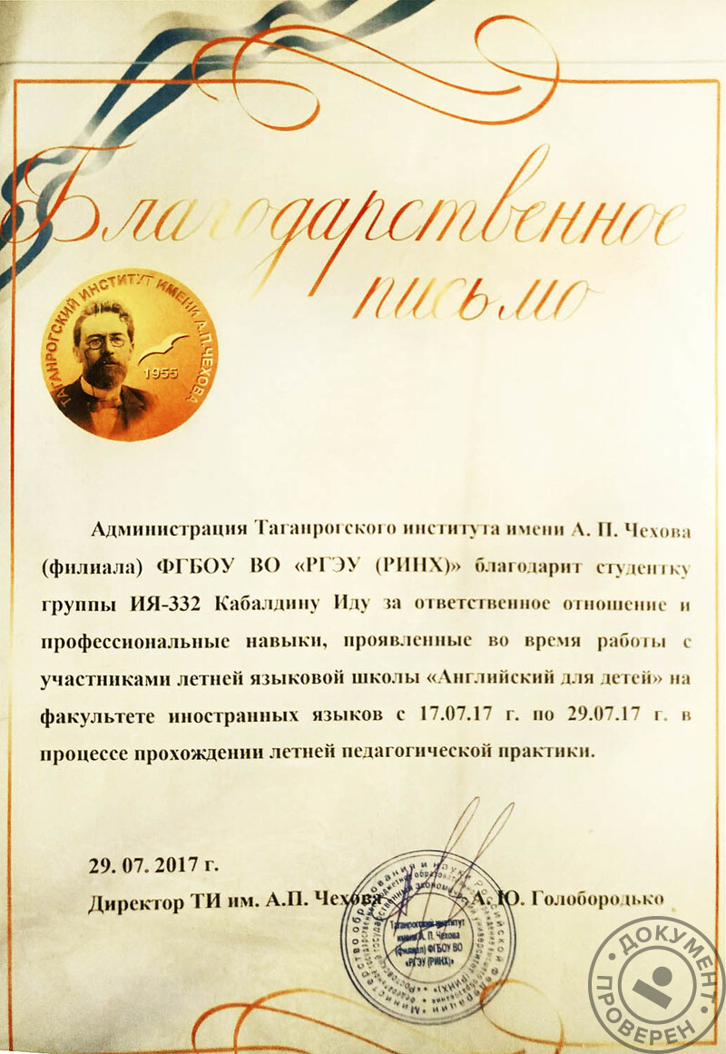 - Благодарственное письмо за работу в летней языковой школе «Английский для детей» на факультете иностранных языков ТИ им. А.П. Чехова в процессе прохождения педагогической практики (2017 г.).