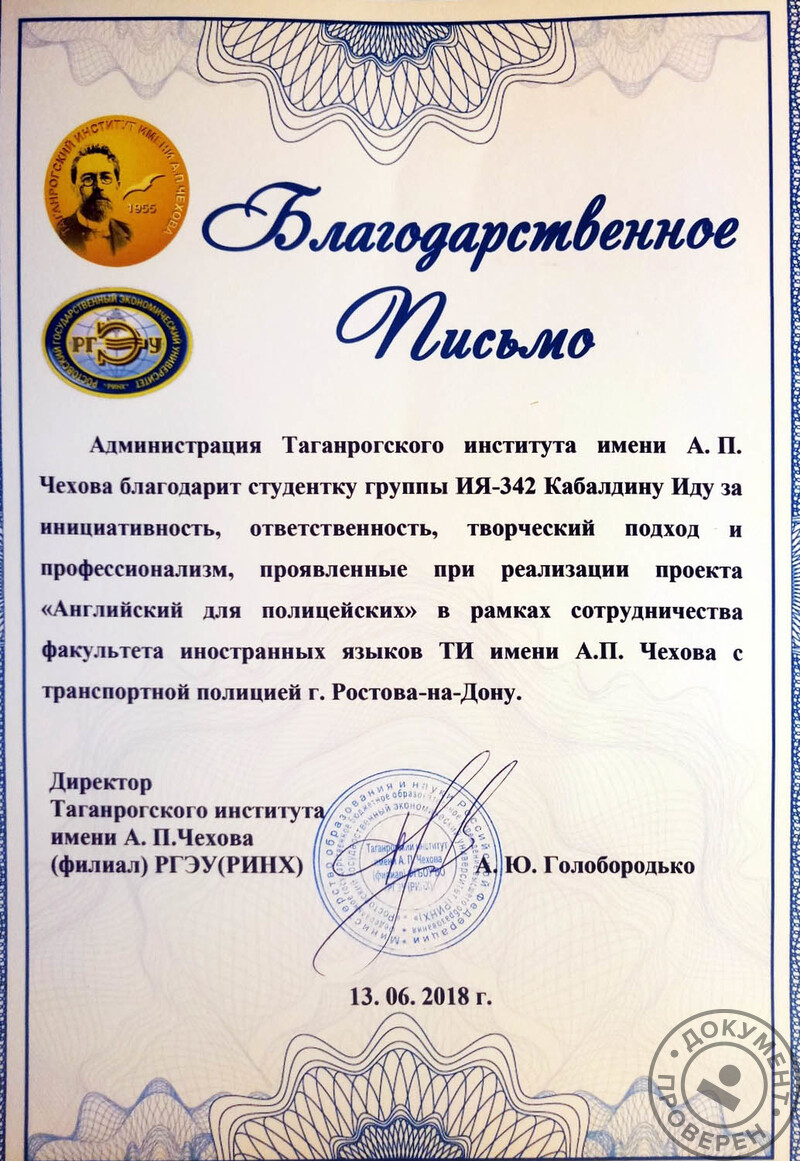 - Благодарственное письмо за участие в проекте «Английский для полицейских» ТИ им. А.П. Чехова и транспортной полиции г. Ростова-на-Дону (2018 г.).