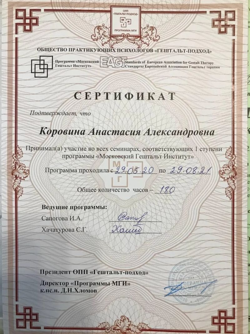 - Общество практикующих психологов «Гештальт-подход», программа «Московский гештальт институт», первая ступень, 2020–2021 гг.