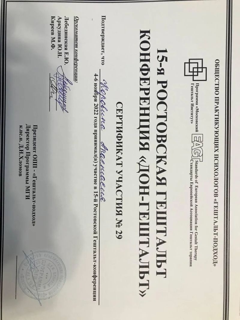 - Общество практикующих психологов «Гештальт-подход», пятнадцатая Ростовская гештальт конференция «Дон-гештальт», 2022 г.