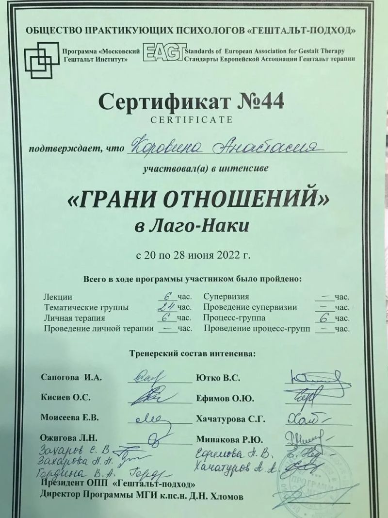 - Общество практикующих психологов «Гештальт-подход», интенсив «Грани отношений», 2022 г.