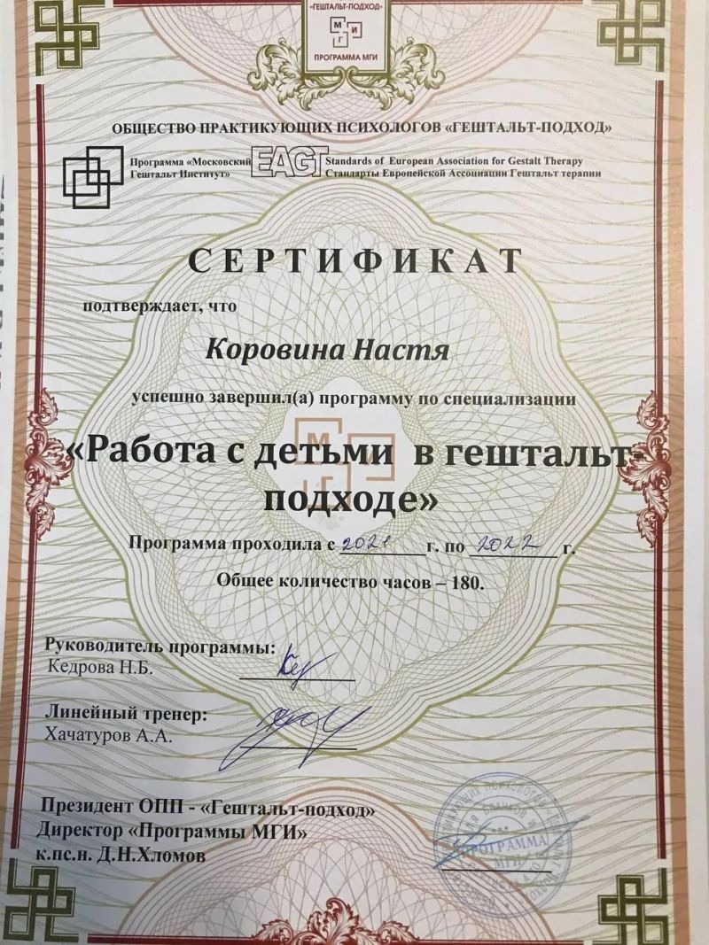 - Общество практикующих психологов «Гештальт-подход», специализация «Работа с детьми в гештальт-подходе», 2021–2022 гг.