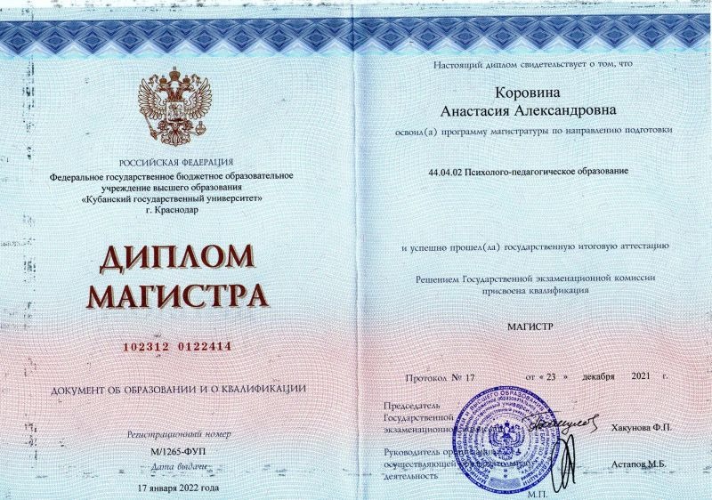 - Кубанский государственный университет, Педагог-психолог, 2019–2021 гг.