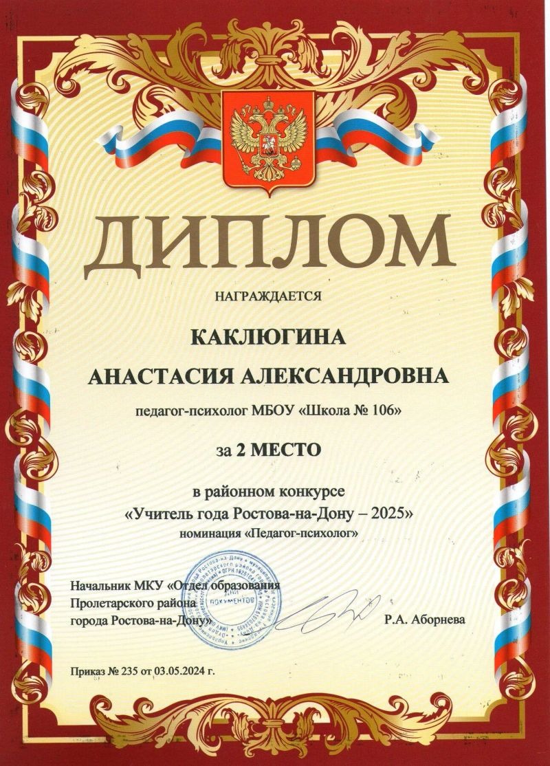 - 2 место в конкурсе «Учитель года Ростова-на-Дону — 2025», номинация «Педагог-психолог», 2024 г.