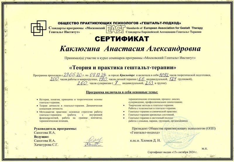 - Московский гештальт институт (МГИ), Гештальт, 1092 часов, 2020–2024 гг.