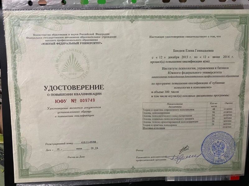 - Южный федеральный университет, программа повышения квалификации «Глубинная психология и психоанализ», 2013–2014 гг.