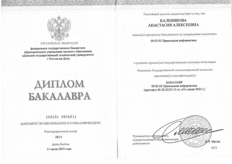 - Донской государственный технический университет, прикладная информатика в информационной сфере, бакалавр, 2019–2023 гг.