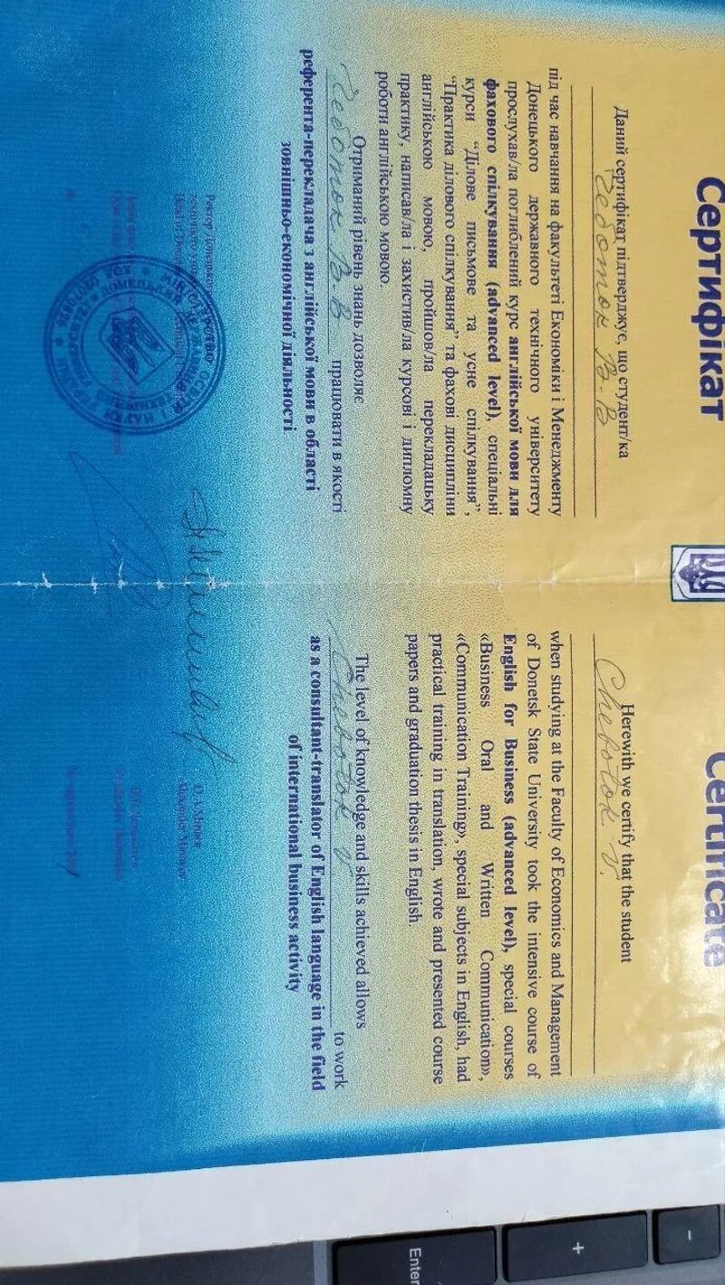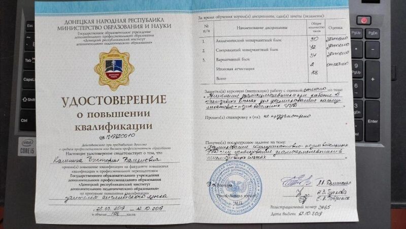 - Донецкий республиканский институт дополнительного педагогического образования, повышение квалификации учителей английского языка, 2019 г.