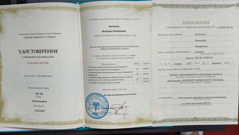 - ЧОУ ВО «Южный университет (ИУБиП)», повышение квалификации по программе «Инклюзивная практика учителя-предметника в условиях реализации ФГОС», 2017 г.
