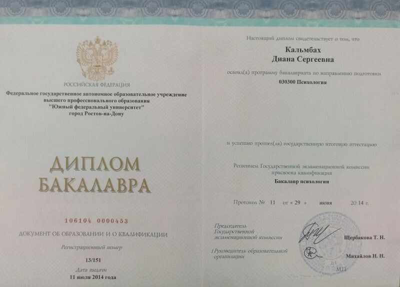 - ЮФУ, психология, бакалавр психологии, 2014 г.