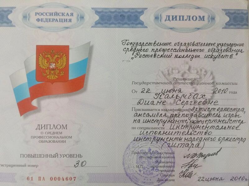 - Ростовский колледж искусств, отделение народных инструментов, квалификация – преподаватель игры на гитаре, артист оркестра, ансамбля, концертмейстер, 2006–2010 гг.