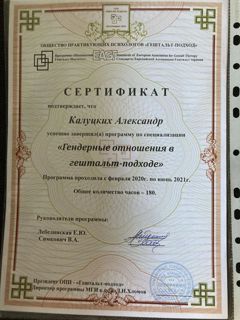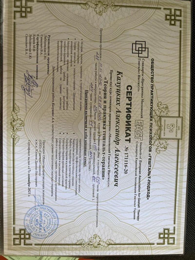 - Московский Гештальт институт, теория и практика гештальт-терапии (с 2021 г.).