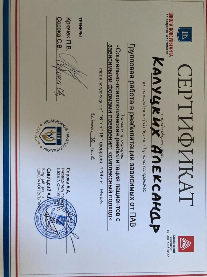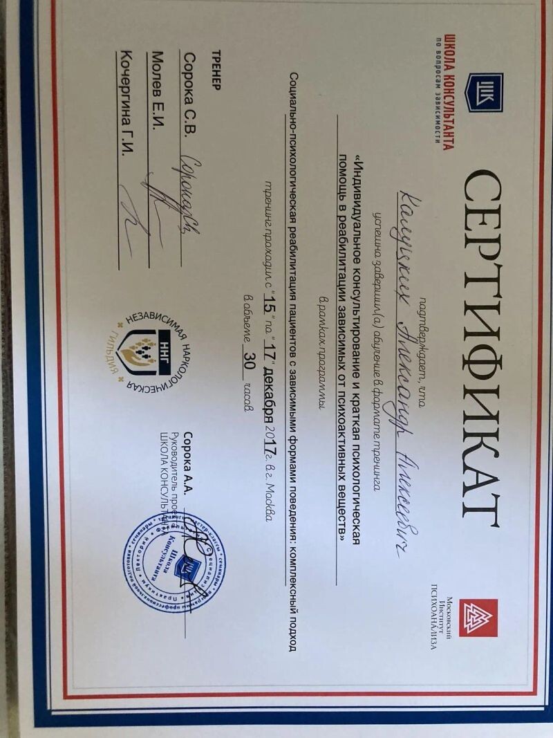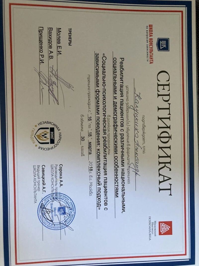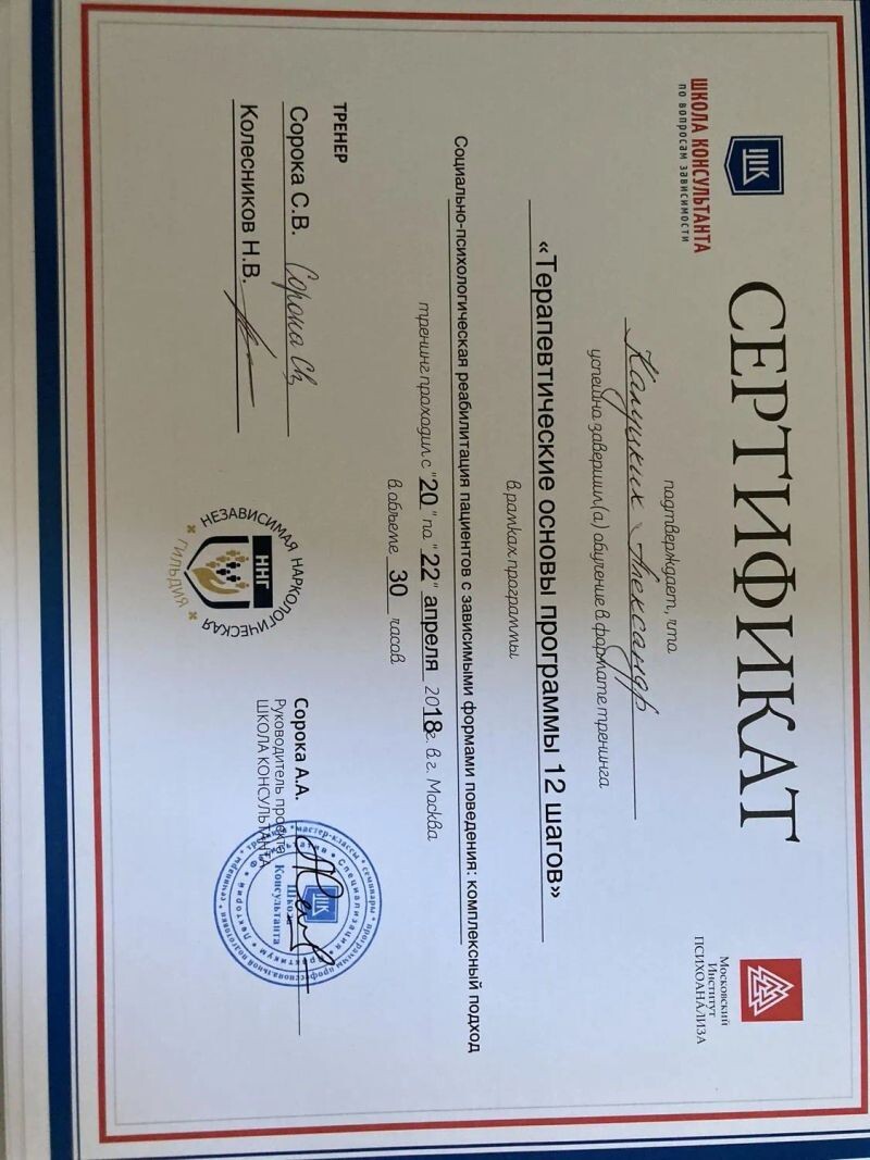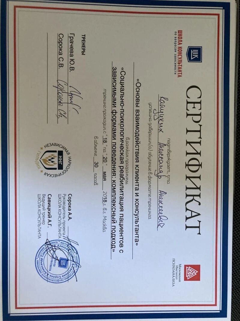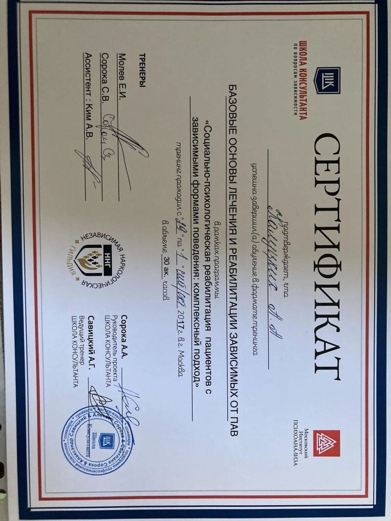 - Московский институт психоанализа, базовые основы лечения и реабилитации зависимых от пав (с 2018 г.).