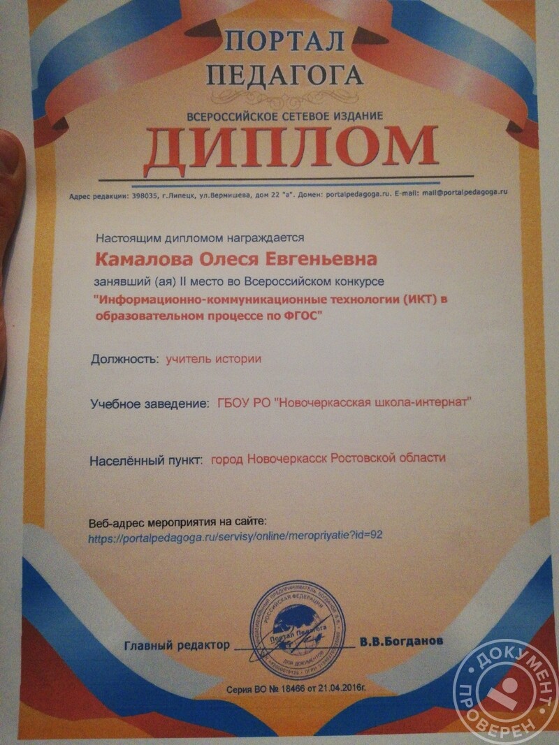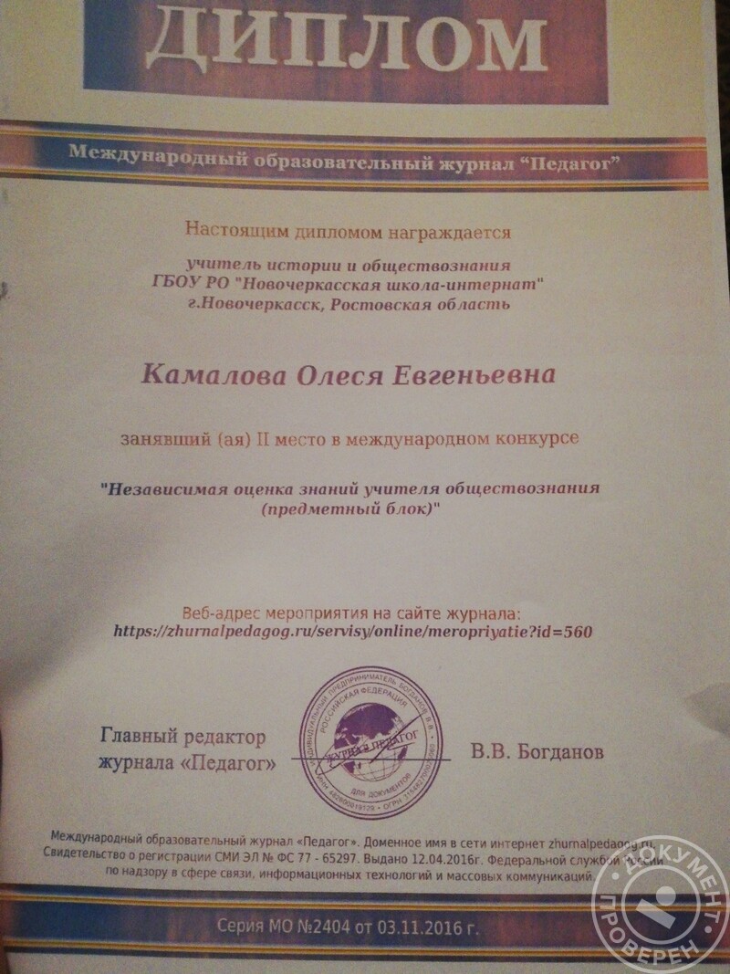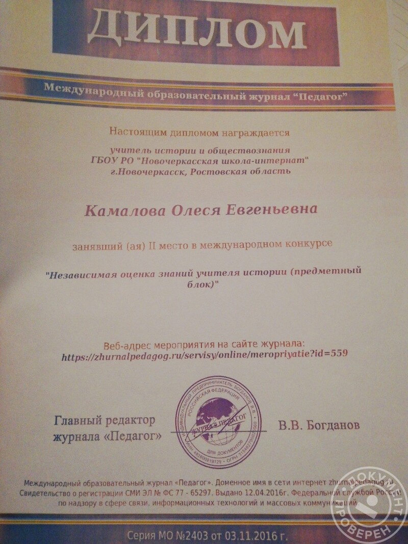- II место в международном конкурсе «Независимая оценка знаний учителя истории», 2016 г.