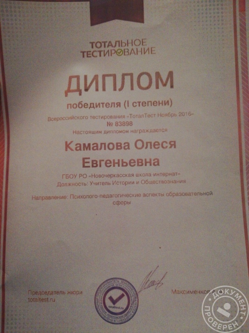 - Диплом победителя I степени Всероссийского тестирования «ТоталТест Ноябрь-2016», направление: «Психолого-педагогические аспекты образовательной сферы».