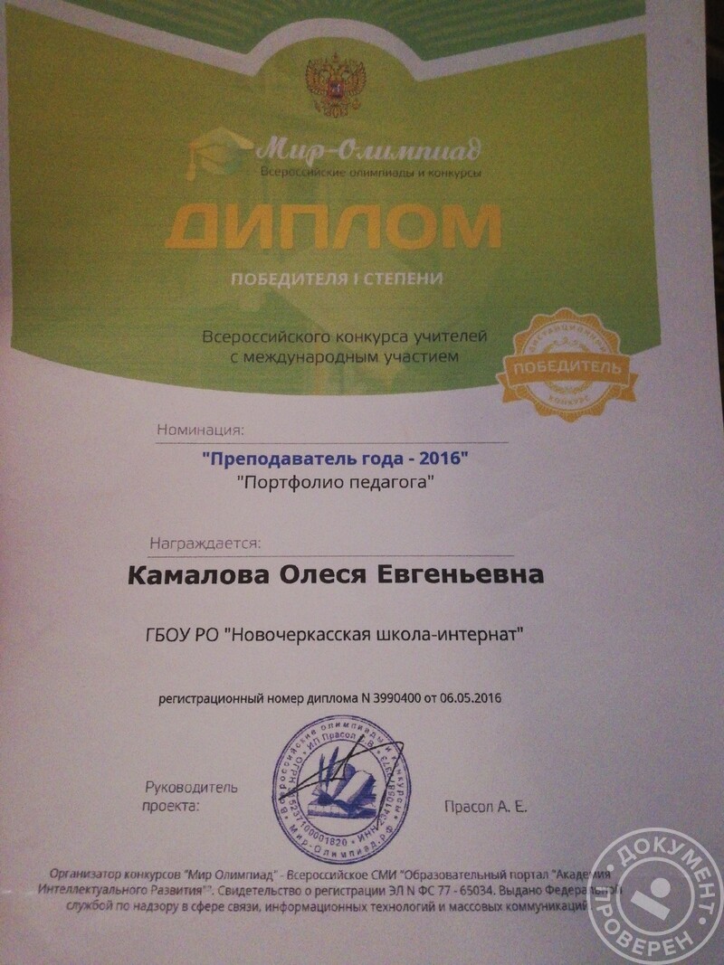 - Диплом победителя I степени Всероссийского конкурса учителей «Преподаватель года», 2016 г.