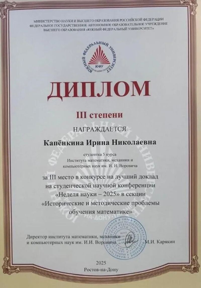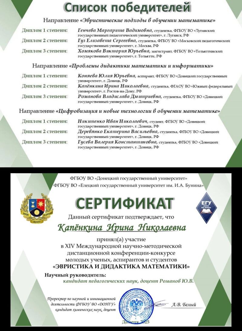 - Диплом II степени XIV Международной научно- методической конференции-конкурсе «Эвристика и дидактика математики» (с 2025 г.).