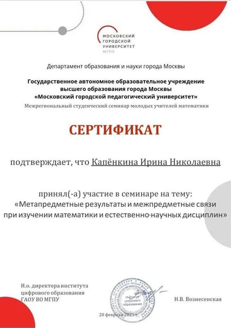 - Сертификат участника семинара на тему «Метапредметные результаты и межпредметные связи при изучении математики и естественно-научных дисциплин» (с 2025 г.).