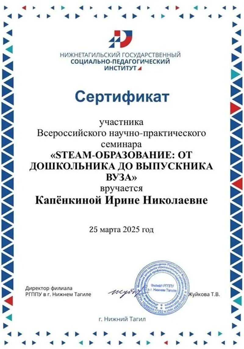 - Сертификат участника семинара на тему «STEAM образование: от дошкольника до выпускника вуза» (с 2025 г.).